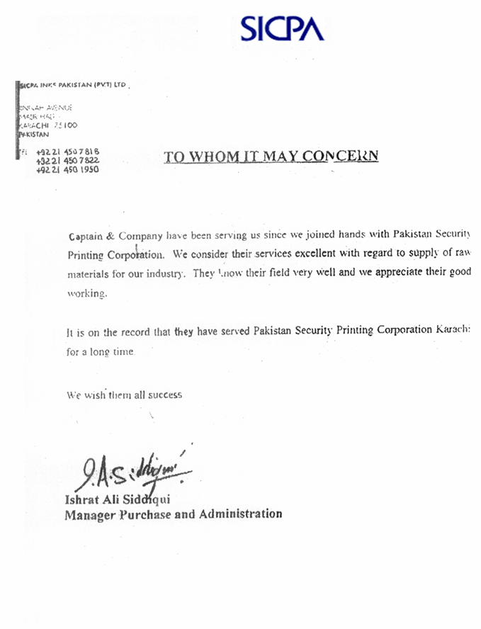 M/s. SICPA Inks Pakistan Pvt. LtdM/s. SICPA Inks Pakistan Pvt. Ltd is a Swiss multinational, manufacturing printing ink for the government agencies & for commercial markets. They appreciated us in these words: "Captain and company have been serving us since we joined hands with Pakistan Security Printing Cooperation. We consider their services excellent with regard to supply of raw material for our industry. They know their field very well and we appreciate their good working. It is on the record that they have served PAKISTAN SECURITY PRINTING COROPORATION KARACHI for a long time. We wish them all success."