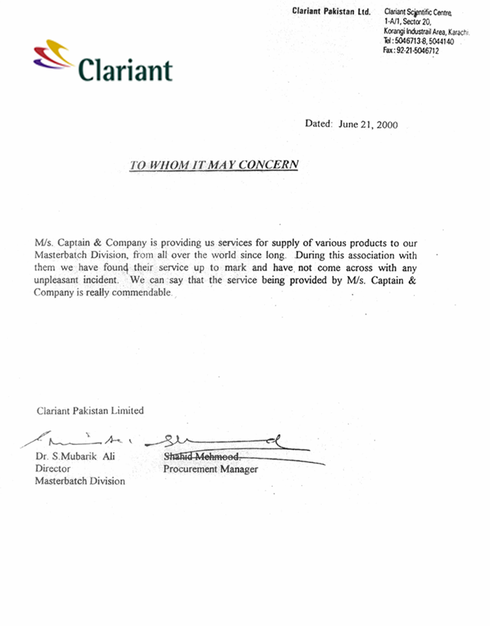 M/s. Clariant Pakistan LtdM/s. Clariant Pakistan Ltd is an multinational company, manufacturing masterbatch in Pakistan. Their comments are: "M/s. Captain and company is providing us services for supply of various products to our Master-batch Division, from all over the world since long. During this association with them we have found their service up to mark and have not come across with any unpleasant incident. We can say that the service being provided by M/s. Captain and company is really commendable." |